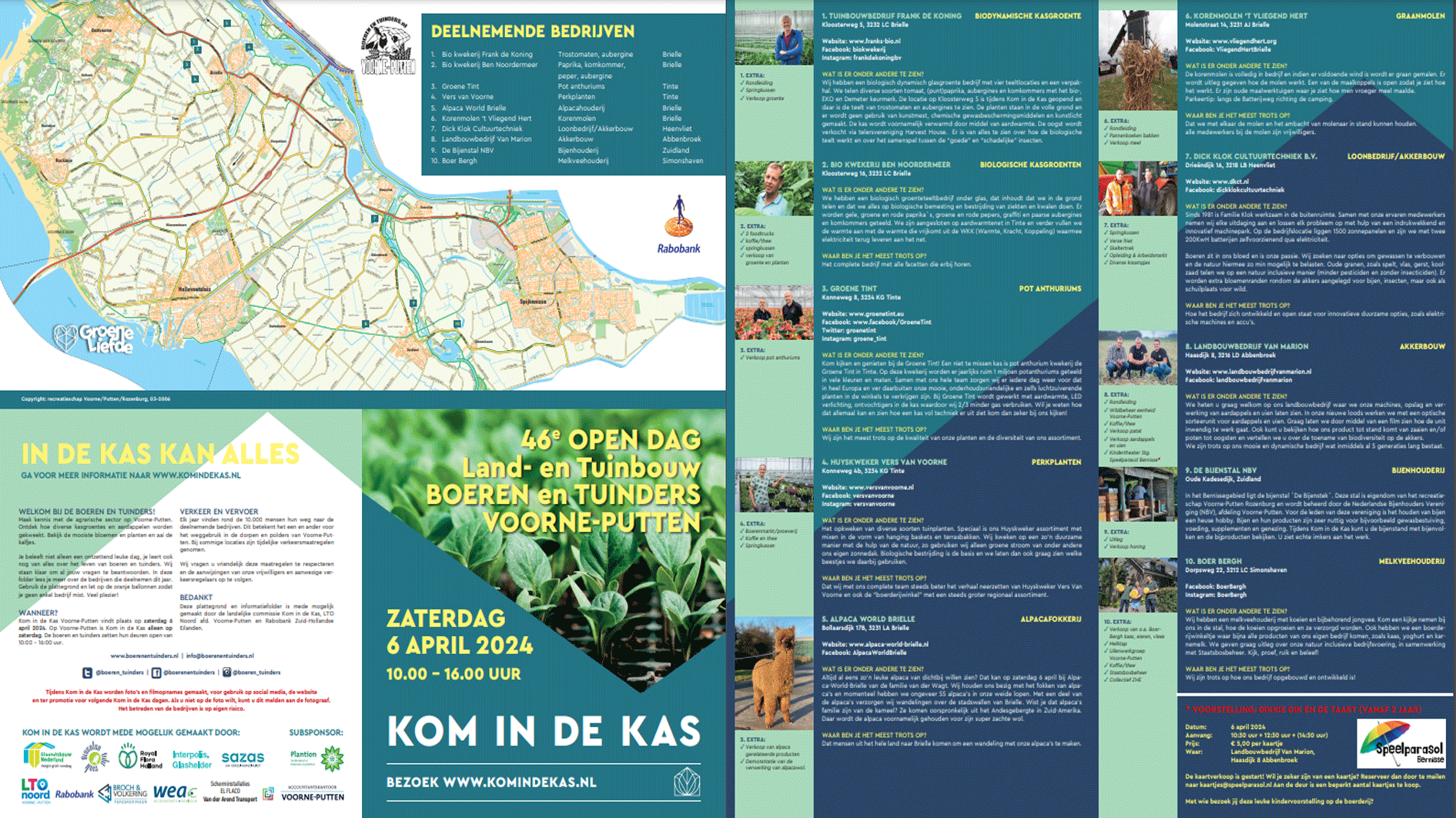 Maak kennis met de agrarische sector op Voorne-Putten. Ontdek hoe diverse kasgroentes en aardappelen worden gekweekt. Bekijk de mooiste bloemen en planten en aai de kalfjes. Je beleeft niet alleen een ontzettend leuke dag, je leert ook nog van alles over het leven van boeren en tuinders. Wij staan klaar om al jouw vragen te beantwoorden. In deze folder lees je meer over de bedrijven die deelnemen dit jaar. Gebruik de plattegrond en let op de oranje ballonnen zodat
